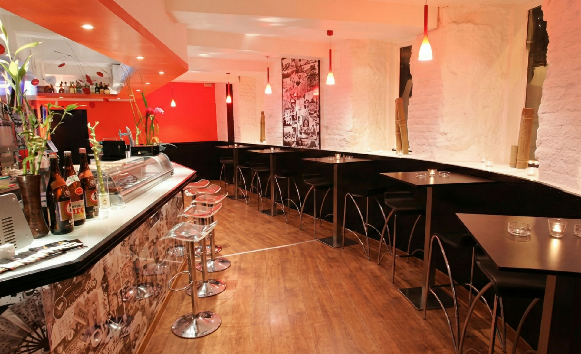 - Collage — A signature graphic resource using a black-and-white pattern of Japanese newspapers and Manga, applied to select printed materials and interior surfaces, most notably the lower section of the bar.