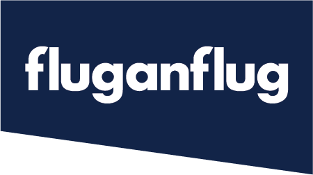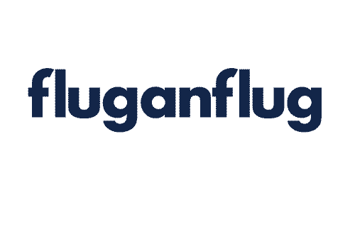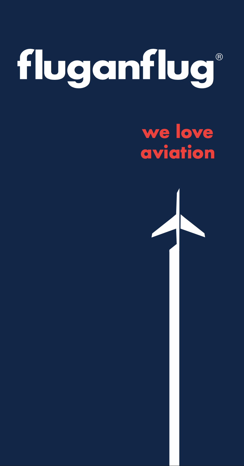 Logotype evoque a clear dark blue sky with fonts in white like a cloud. The approaching descending flight of airplanes before landing generates a diagonal line which splits that sky represented by the box lower slope of Fluganflug logotype.