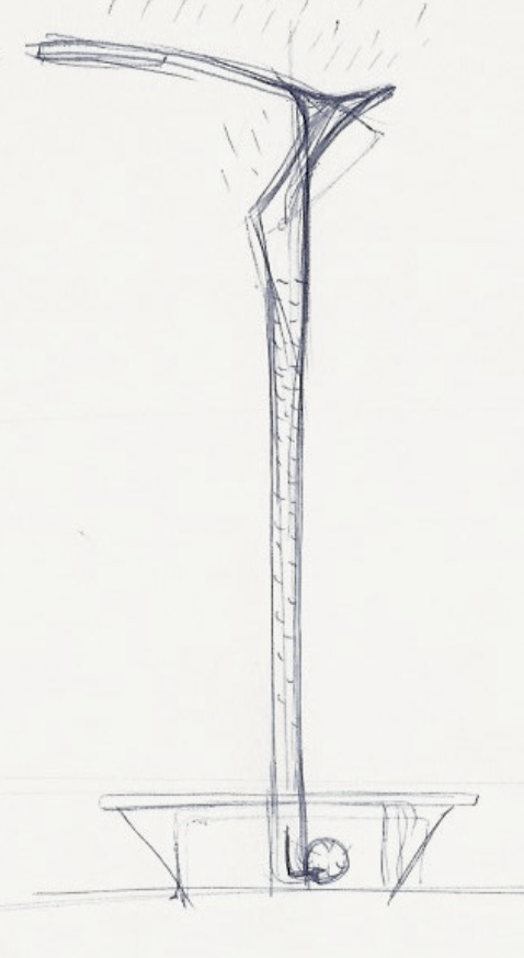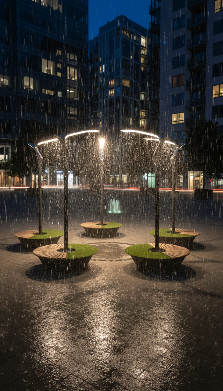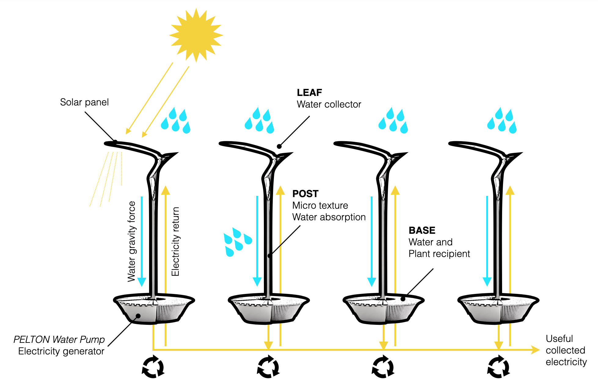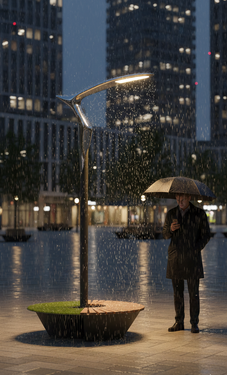Leaf (top surface): Collects rainwater, houses solar panels, and supports downward-facing LED lights
