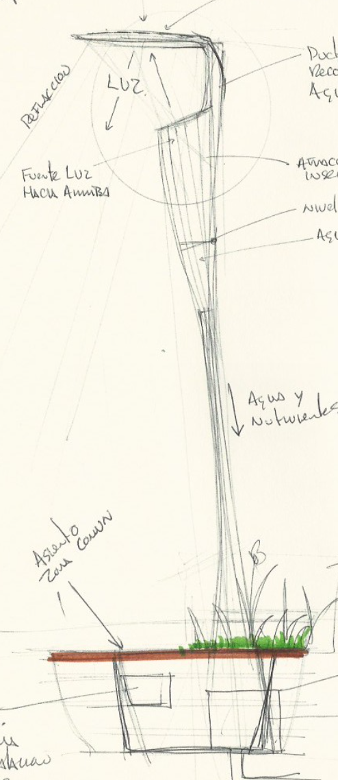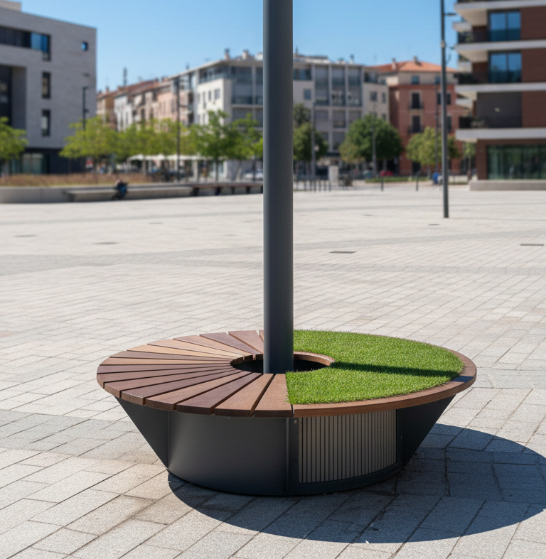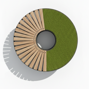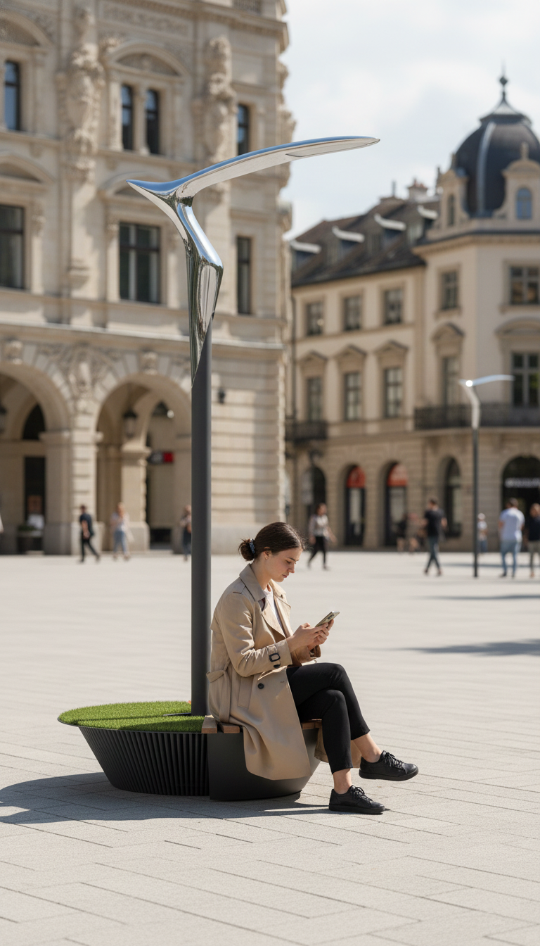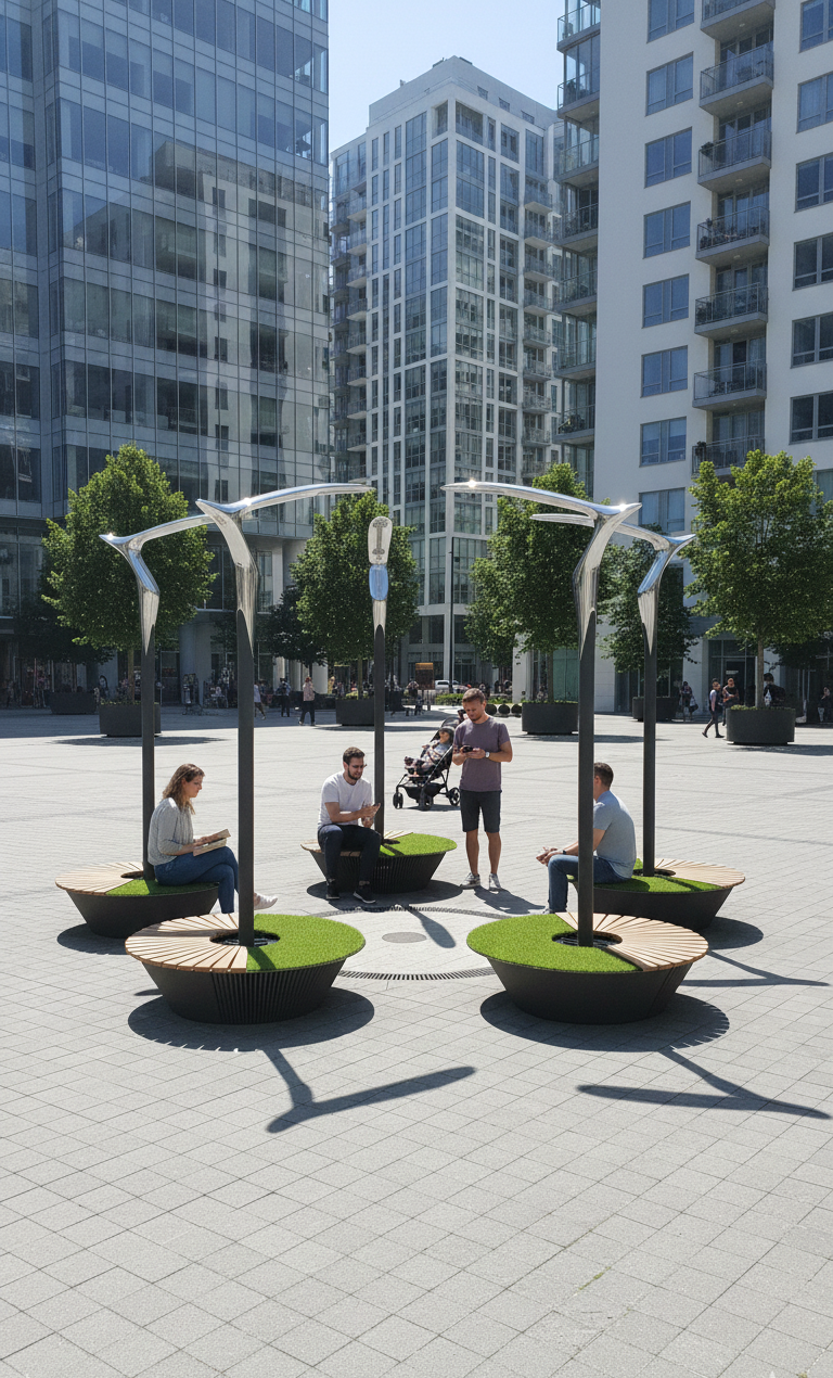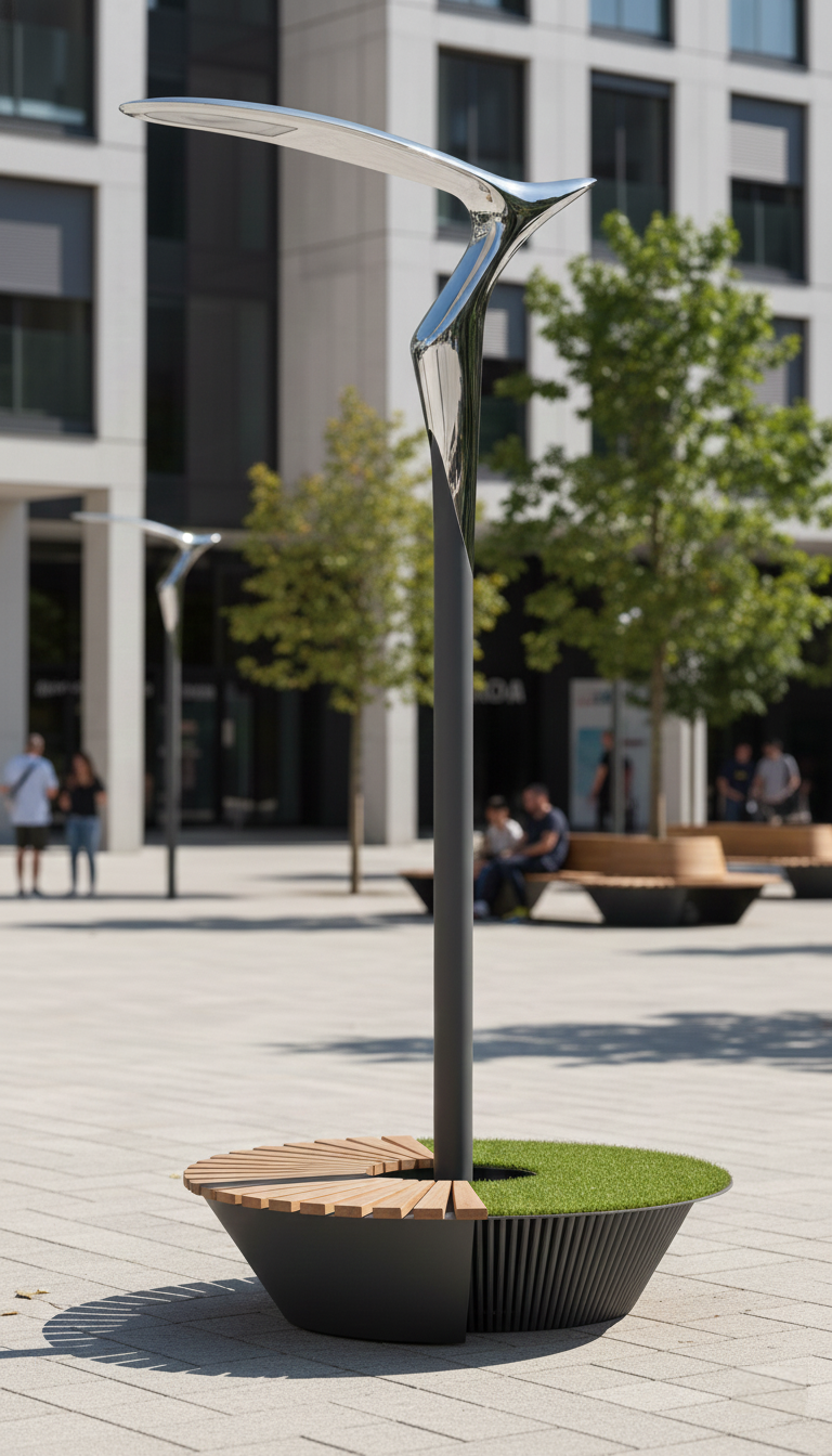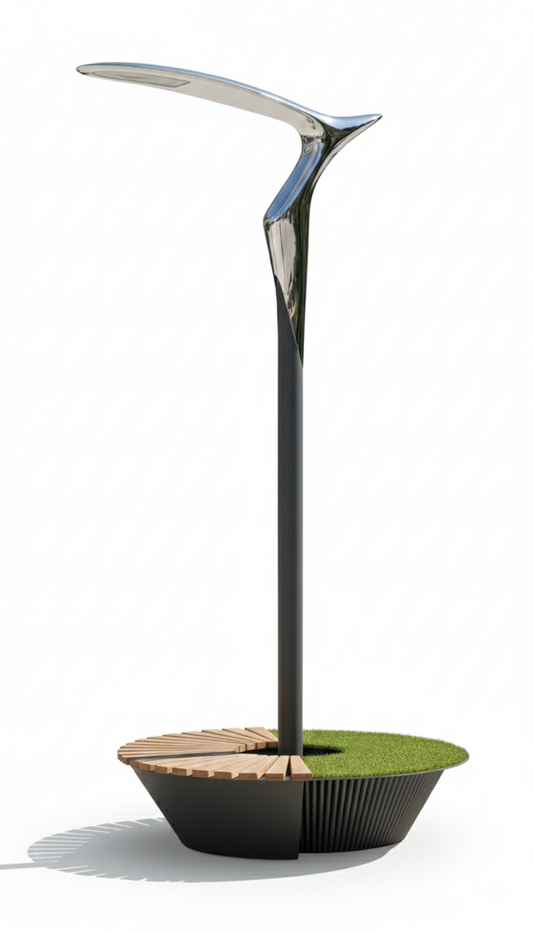 Base: Serves as seating, water collector, and planter, integrating vegetation and control/generation stations.
