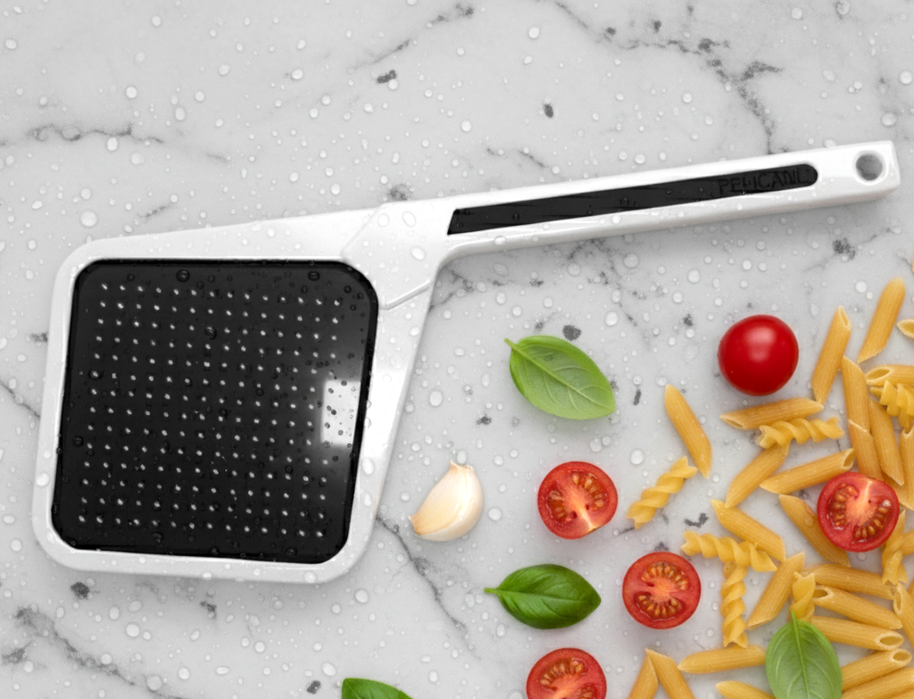 Pelícano es un colador inspirado en el pelícano del Caribe. Un diseño bioinspirado que se transforma con el calor del agua, reduce el espacio de almacenamiento y por su forma, se ajusta al fondo de las ollas, eliminando manipulación constante.